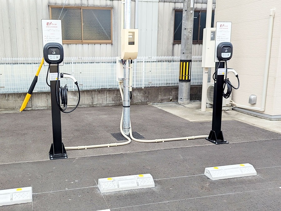 エルエルタウン正面駐車場にてEVステーションを設置いたしました。