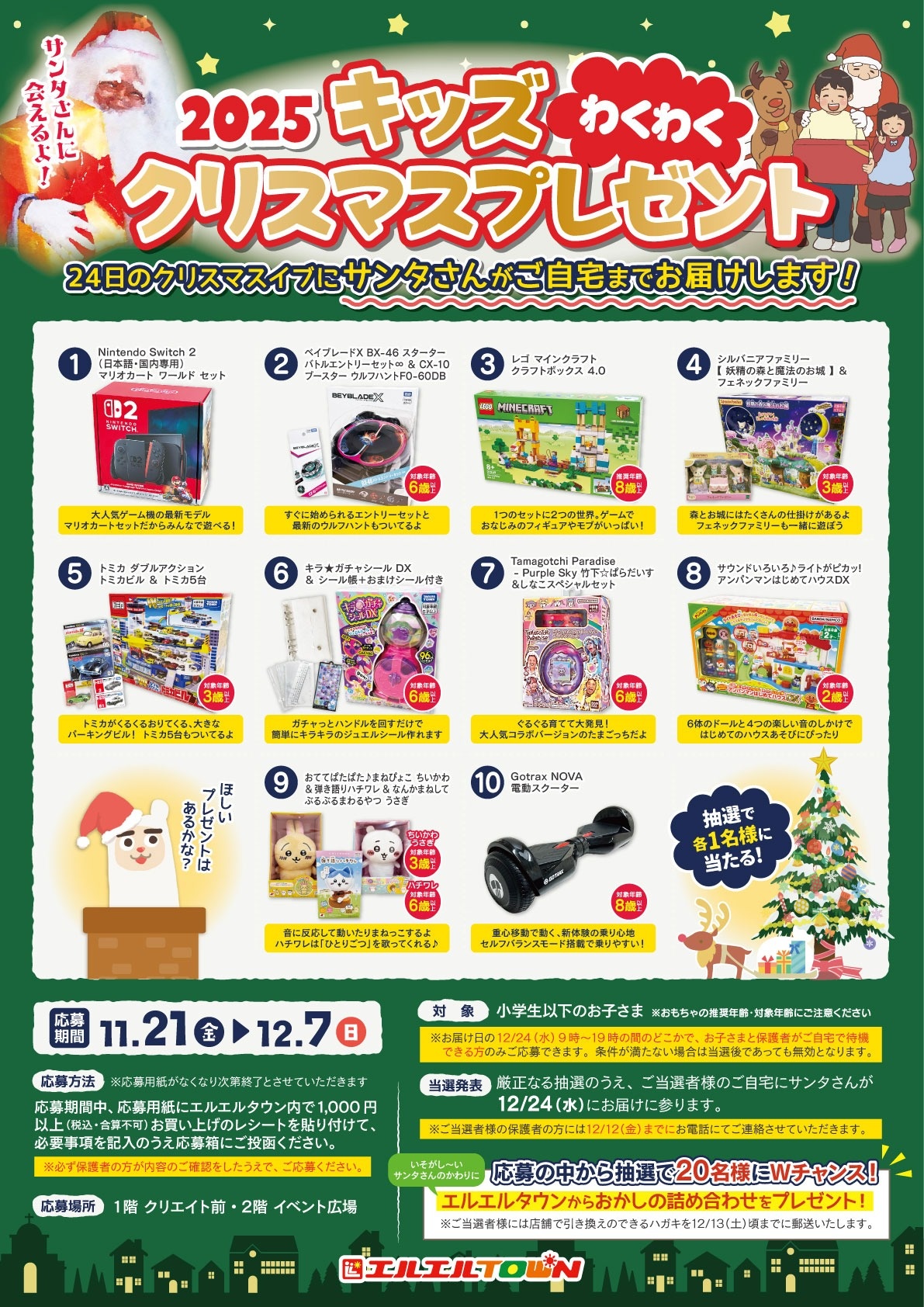 | 応募期間 | 応募期間中、応募用紙にエルエルタウン内で1,000円以上(税込・合算不可)お買い上げのレシートを貼り付けて、必要事項を記入のうえ応募箱にご投ください。 |